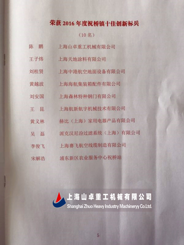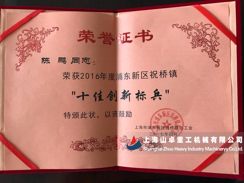 熱烈祝賀上海山卓重工陳鵬獲得2016年度浦東新區祝橋鎮“十佳創新標兵”